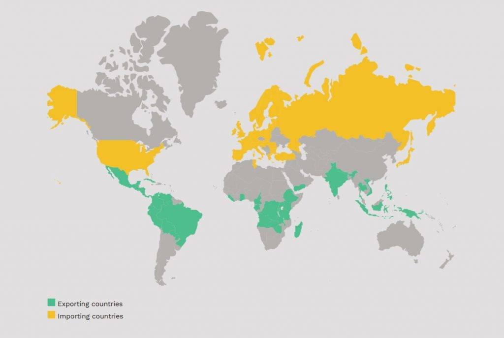 Из восьми десятков стран, где произрастают деревья, только 50 занимаются его экспортом в разные страны мира. Остальные же выращивают его только для внутреннего потребления. Остановимся подробнее на основных поставщиках.