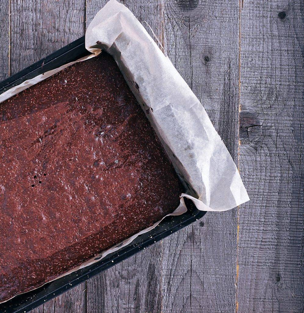 Форму для выпечки выстелите пергаментом или фольгой. Если используете пергамент — смажьте непосредственно саму форму тонким слоем сливочного масла, чтобы избежать пригорания. Оставьте по 3-4 см бумаги нависать над формой, чтобы в дальнейшем было проще вынимать наш брауни.