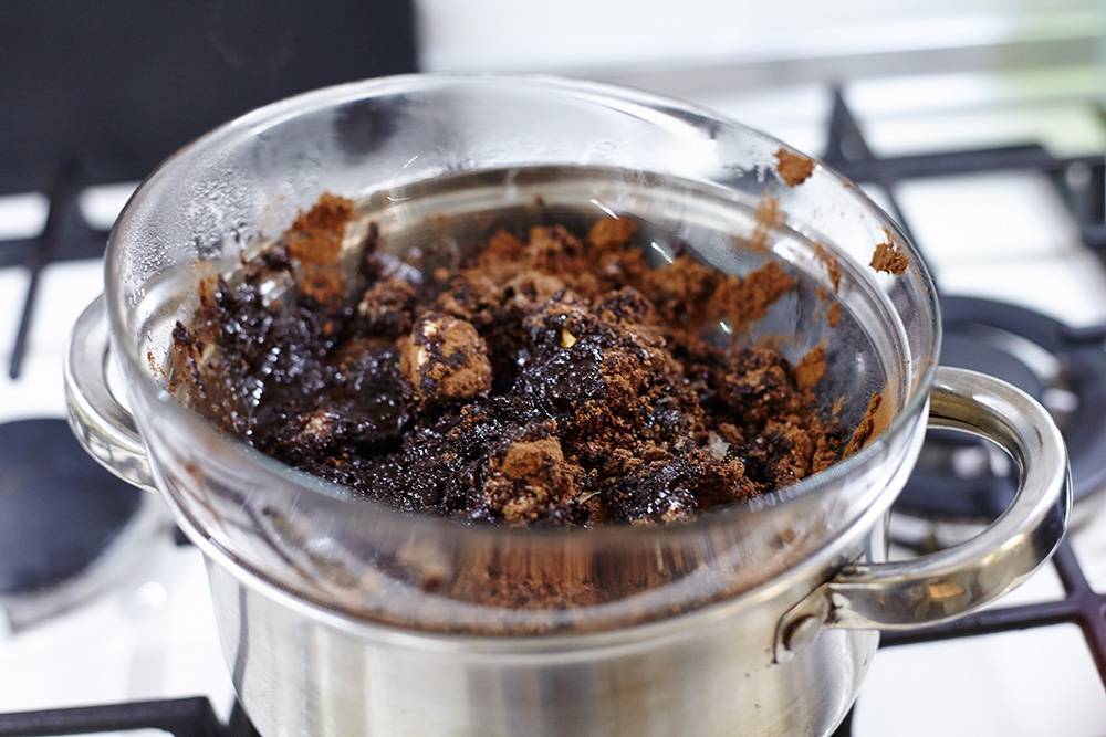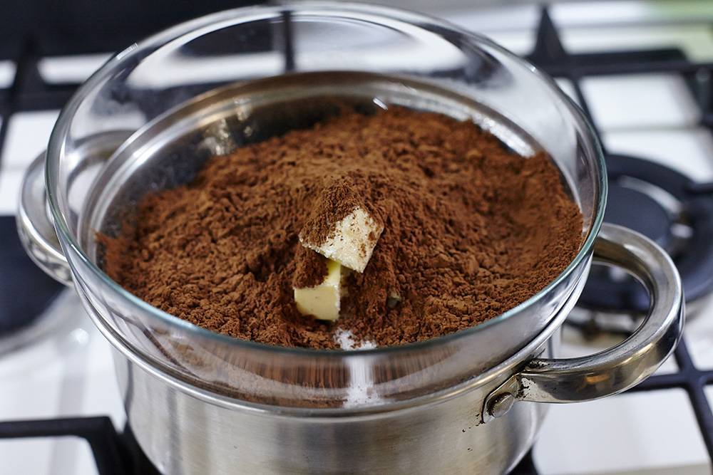 Шаг 2. Растопите на водяной бане сливочное масло смешав с сахаром, какао-порошком и солью
