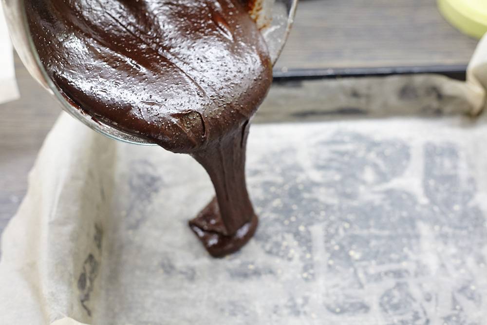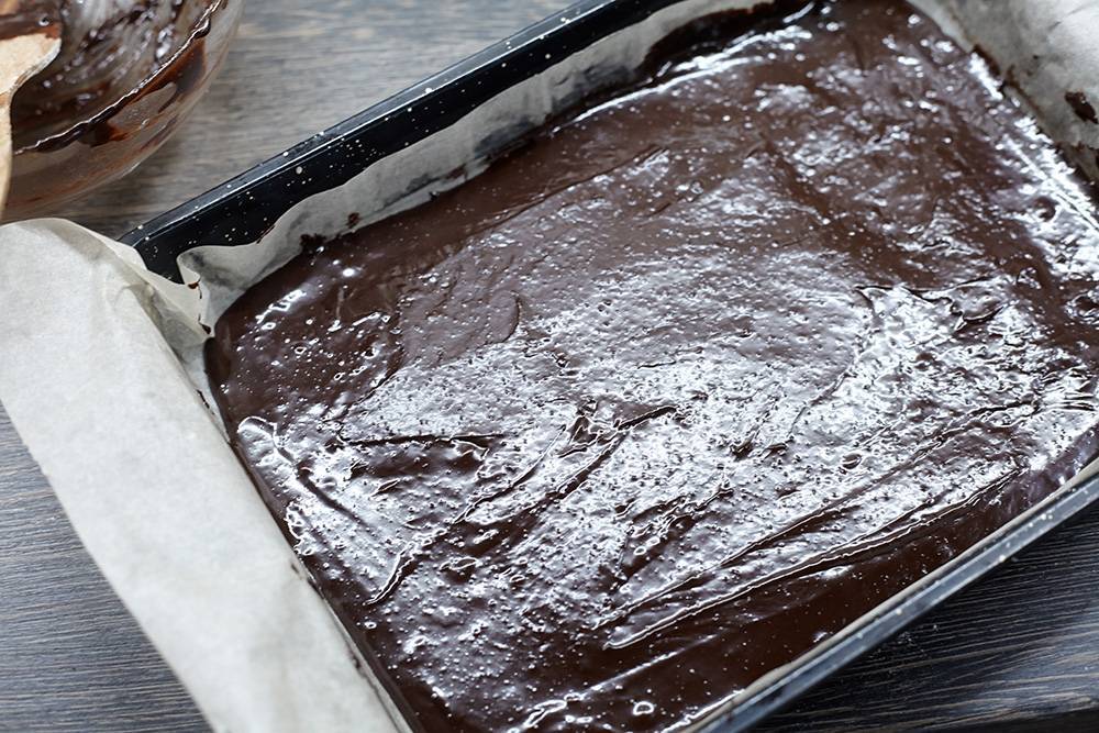 - Вылейте шоколадное тесто в форму для запекания, застеленную пергаментом.