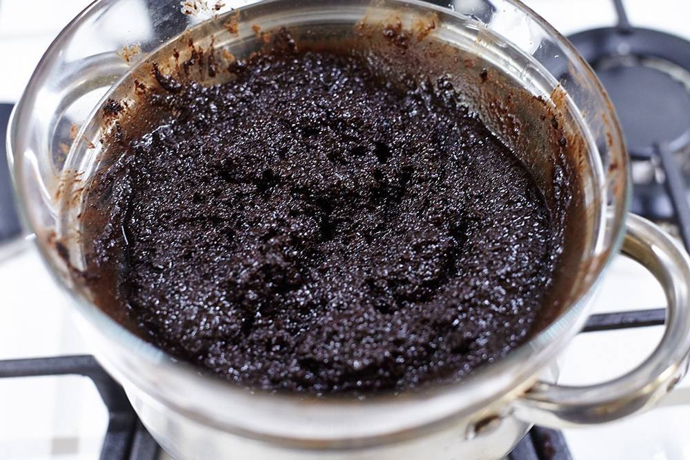 Прежде чем перейти к следующим шагу и добавлению остальных ингредиентов нужно дать нашей массе остыть на протяжении 5-8 минут. Для этого снимите ее с водяной бани и разместите где-нибудь на рабочей поверхности. Огонь под кастрюлей тоже можно выключить — она нам больше не понадобится.