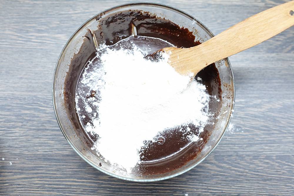 Шаг 5. Добавьте муку, перемешайте до однородности. Перелейте в форму и отправьте в духовку