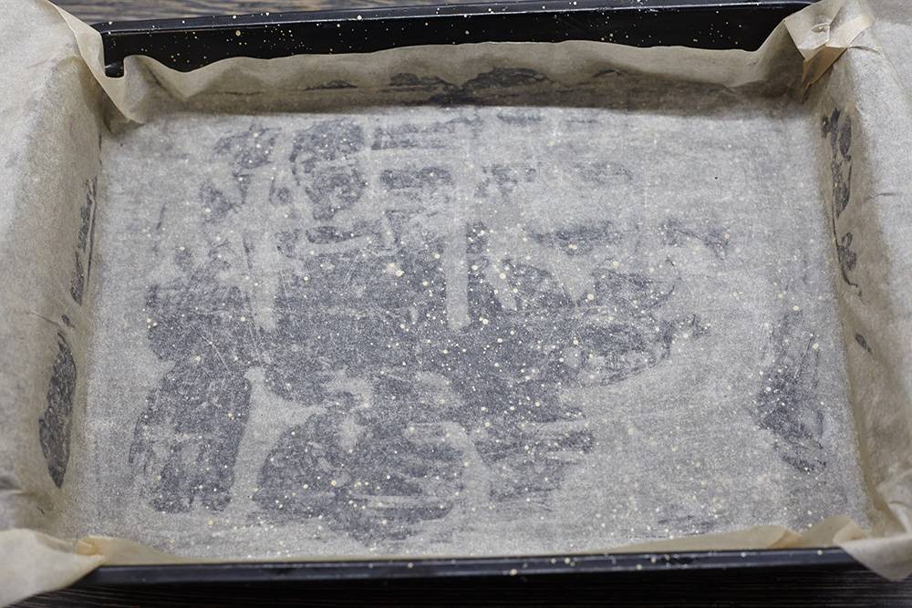 - Разогрейте духовку до 165 С и подготовьте форму выстелив пергаментом и смазав растительным маслом.