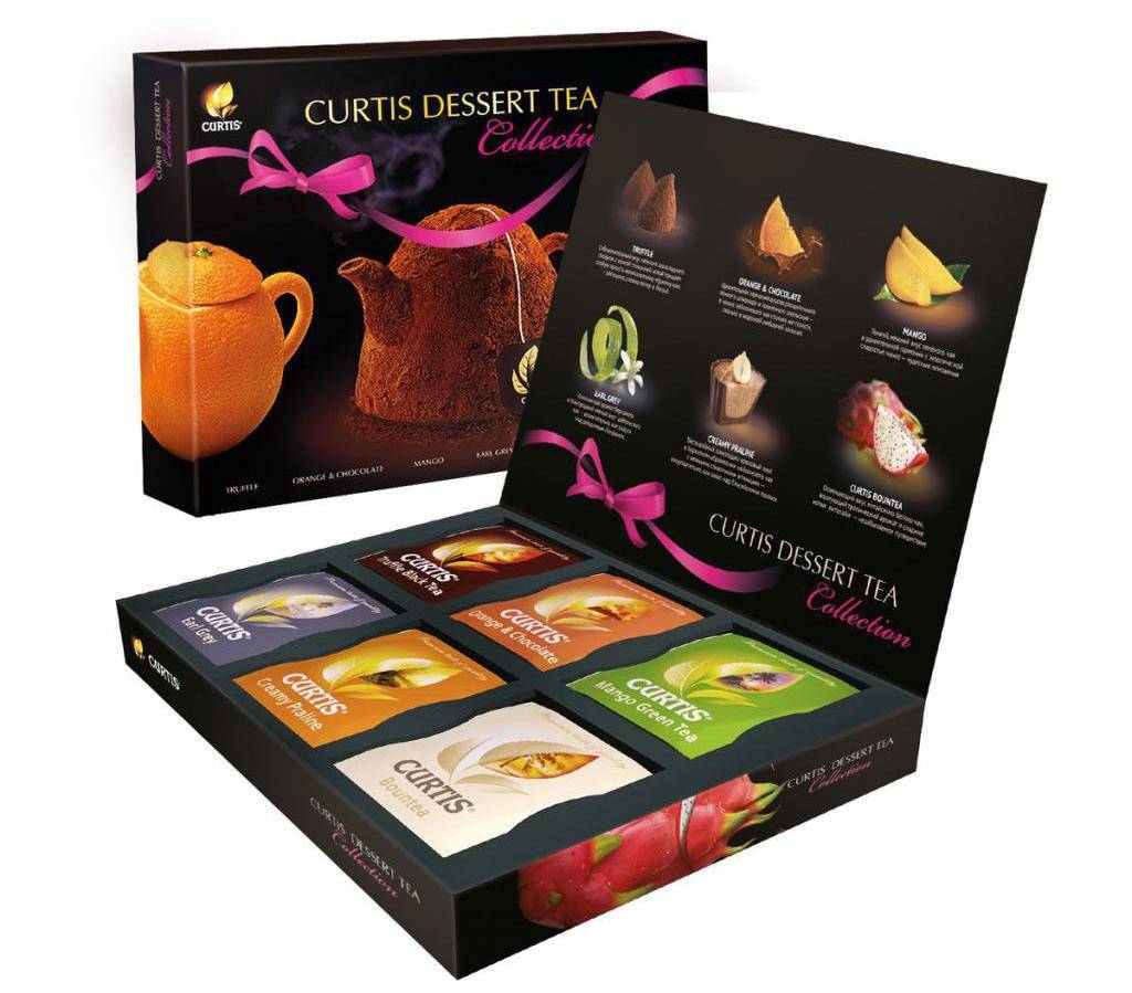 - Curtis Dessert Tea Cokkection, которая включает 6 лучших десертных чаев бренда с разными вкусами и ароматами в фольгированных сашетах;