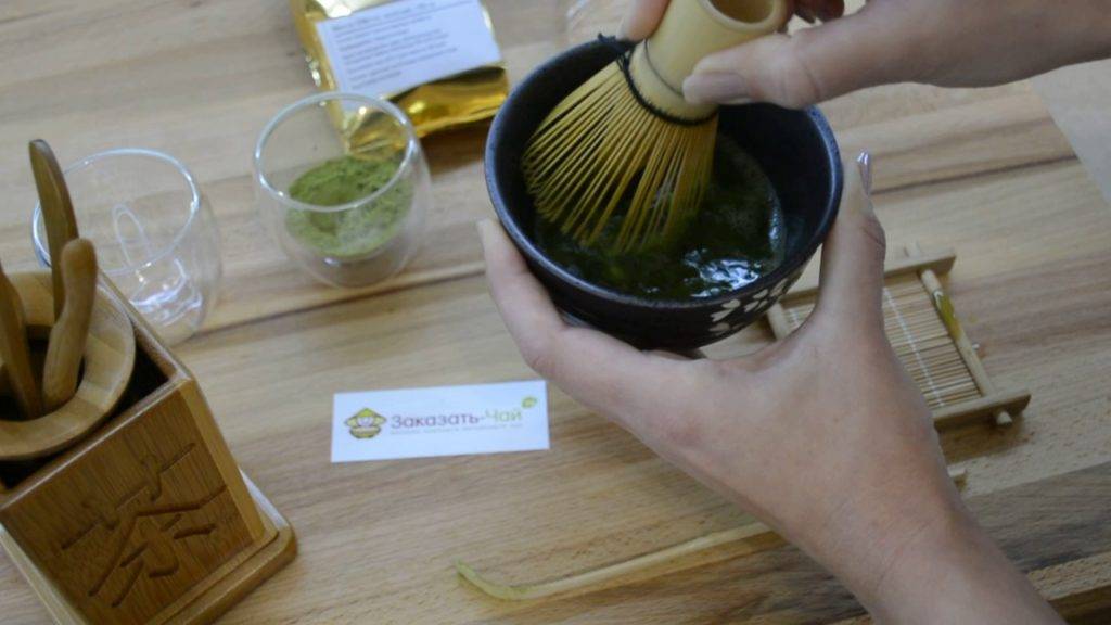 После этого берут тясен. Он представляет собой венчик, изготовленный из бамбука, которым взбивают матча. Действие повторяют до тех пор, пока жидкость не будет однородной и пенистой.