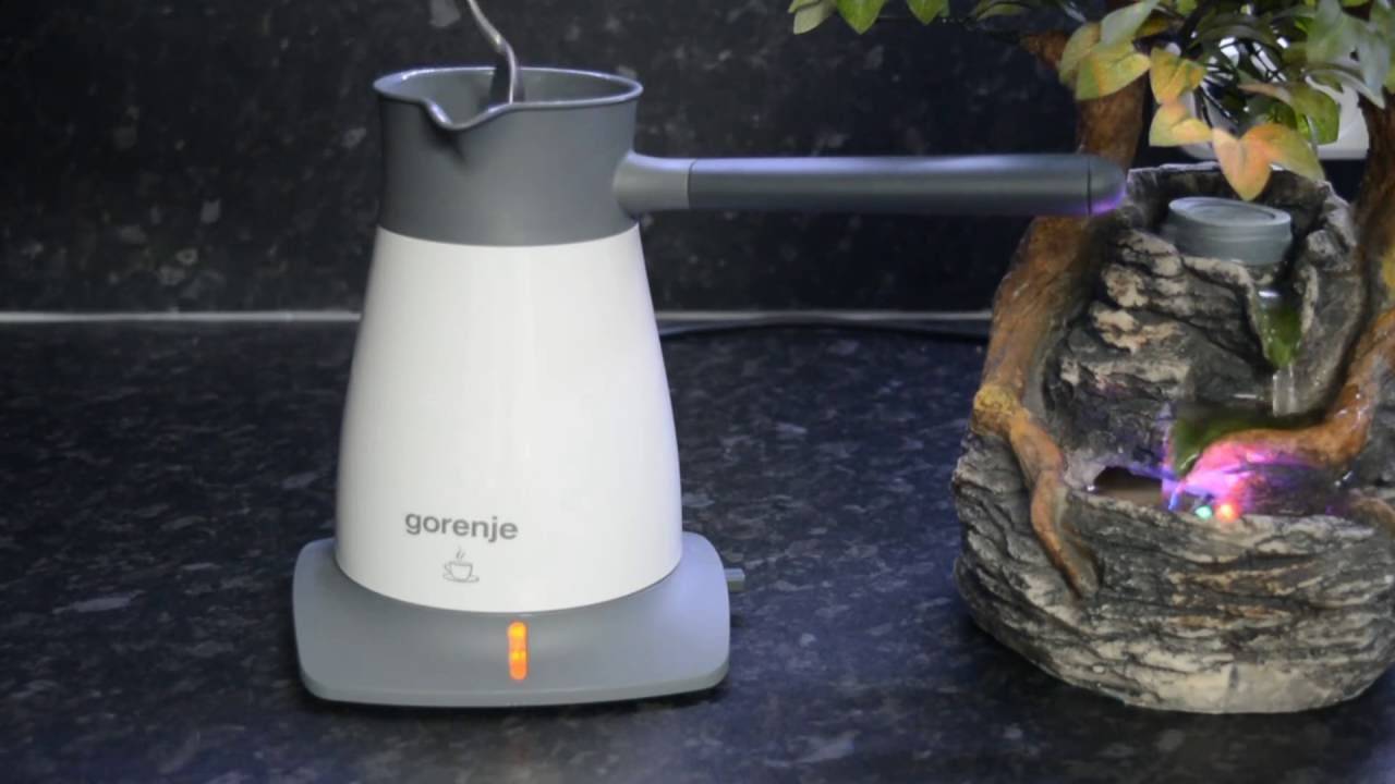 Электрическая турка Gorenje. Мощность прибора 800 Вт, что не дает воде быстро закипать, поэтому кофейный порошок лучше экстрагируется. Стенки внутри выполнены из нержавеющей стали, а сверху пластиковые – это позволяет снижать температуру корпуса во время варки. Объем джезвы 300 мл рассчитан на 3 порции кофе.