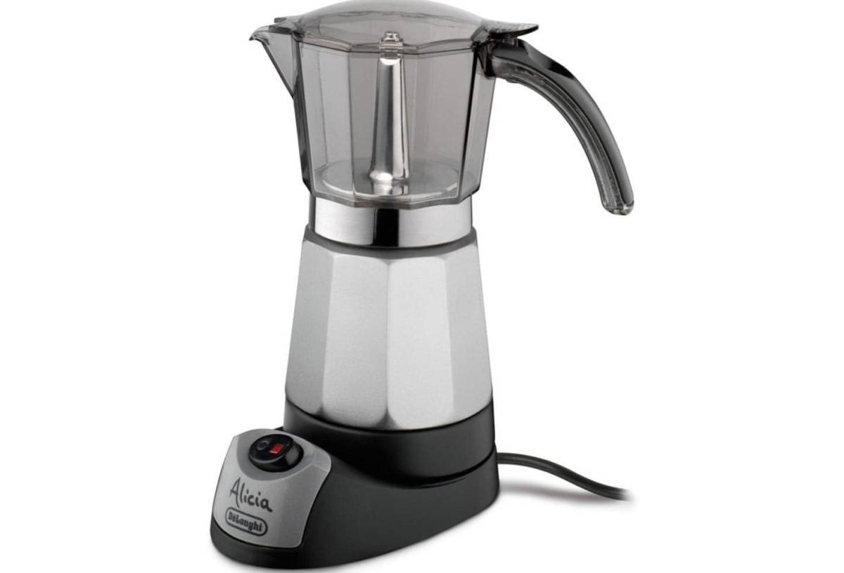 - DeLonghi EMK 9 Alicia. Вид и оформление товара соответствуют классической моке, однако данная кофеварка отличается прозрачной верхней колбой. Мощность нагревателя — 450 Вт. Управление состоит из 1 кнопки включения, т.к. большую часть работы берет на себя искусственный интеллект. Объем резервуара достигает 350 мл. Есть несколько вариаций изделия разного размера.