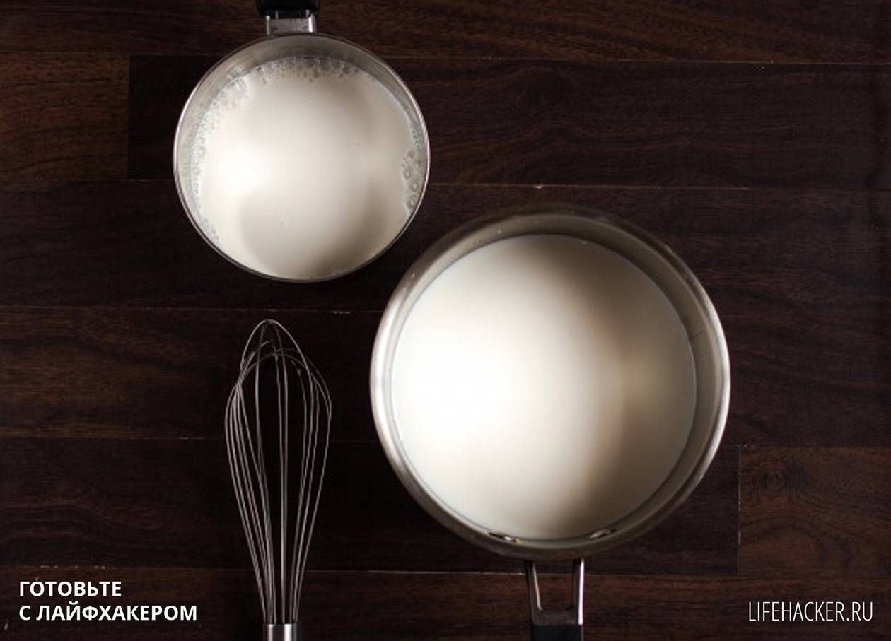 - Сливки и молоко влить в кастрюлю и поставить на умеренный огонь.