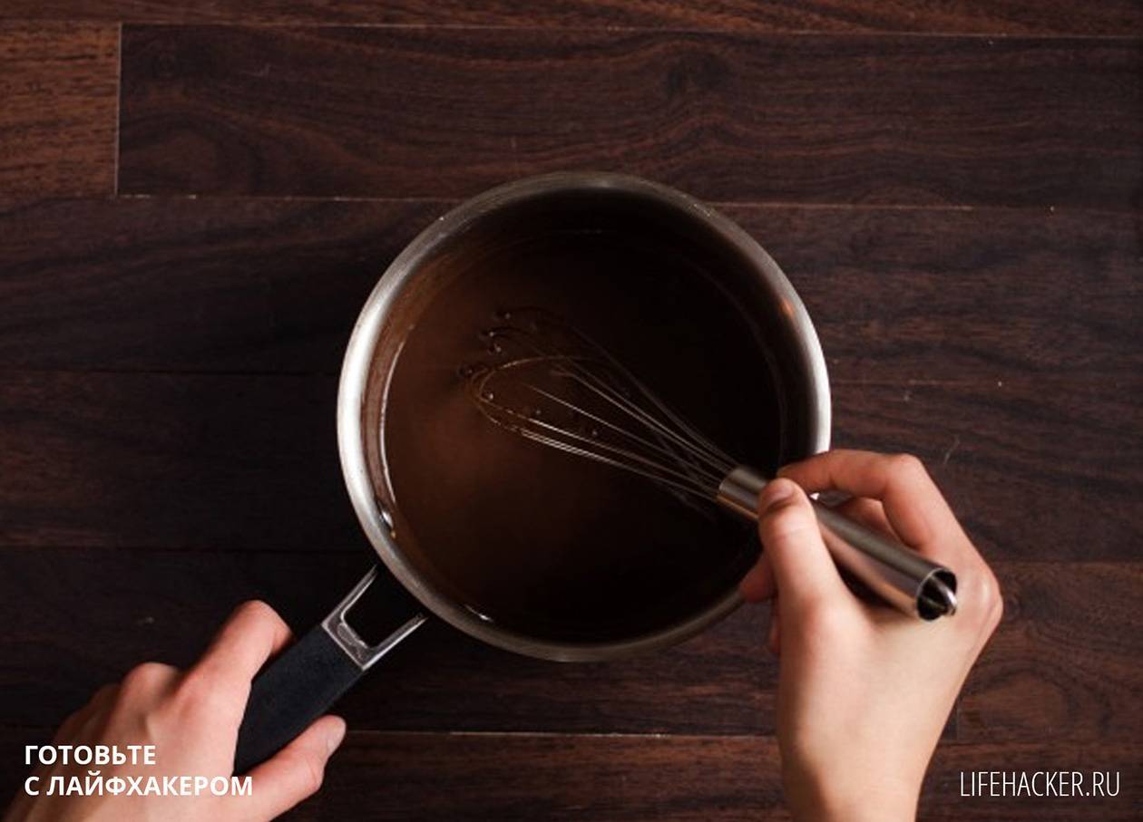 - Поставить кастрюлю на медленный огонь и помешивать содержимое, пока шоколад не растворится.