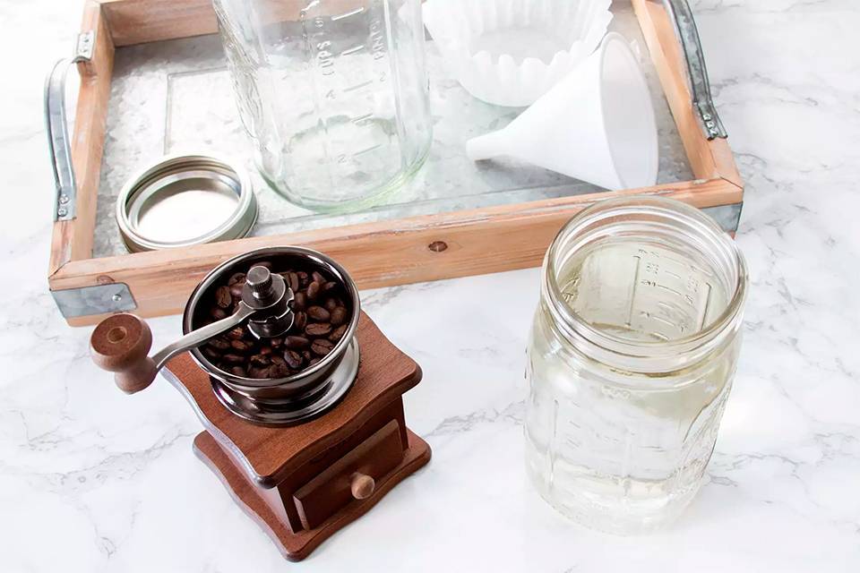 В большую банку добавьте молотый кофе. Медленно наливайте 4 стакана воды на зерна, медлено перемешивая, пока кофе не станет полностью насыщенным.