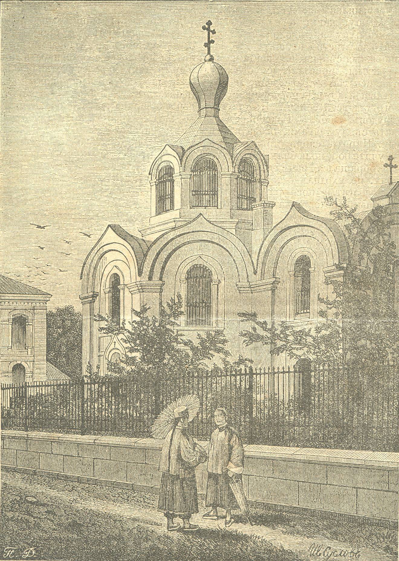 Православный храм в Ханькоу (сейчас Ухань), Китай, выстроенный на деньги русских торговцев китайским чаем. Гравюра. Конец XIX векаИз коллекции автора