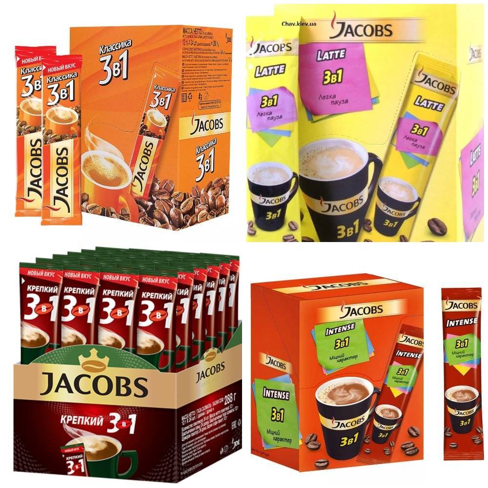 Jacobs 3 в 1. В одном пакетике содержится кофейный порошок, сахар, сухие сливки или молоко, ароматизатор. Кофе Якобс 3 в 1, который выпускается в стиках, удобно брать с собой в поездки или использовать на работе, когда нет времени или возможности приготовить натуральный напиток. Производитель предлагает несколько вкусов растворимого сублимата: классический, капучино, крепкий, латте карамель, мягкий.