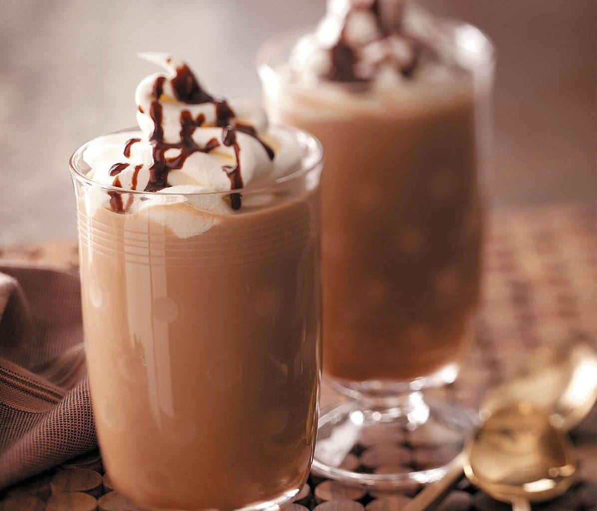 В высокий стеклянный бокал вливают шоколад, затем – взбитую смесь. Завершающий аккорд – украшение из взбитых сливок.