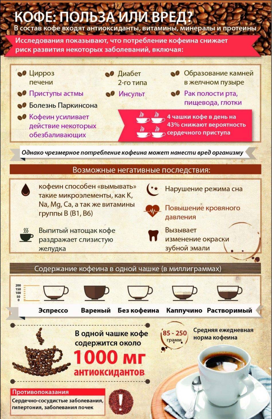 Польза кофе очевидна, но и увлекаться ароматным напитком также не следует. Врачи рекомендуют выпивать не более 2 чашек в день относительно здоровым людям, и всего лишь одну – тем, у кого есть хронические заболевания и предрасположенности к ним. Желательно отказаться от кофе за 6 часов до сна.