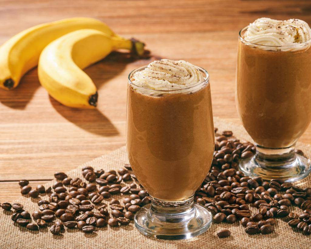 220 мл обезжиренного молока соединяют с измельченным бананом и чайной ложкой кофе. Растирают продукты в блендере.