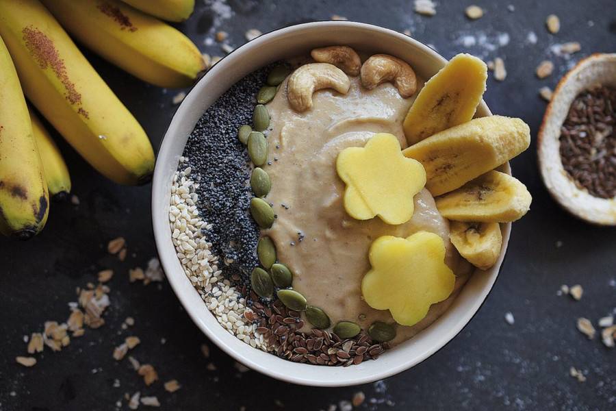 Есть рецепты смузи боулов на молоке или йогурте с арахисовой пастой и овсяными хлопьями: паста даст телу белок, хлопья обеспечат клетчаткой, банан — железом, калием и магнием.