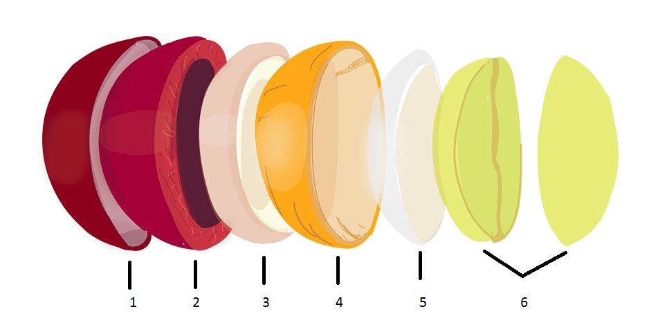 - Мякоть (пульпа). У зелёных ягод она твёрдая, по мере созревания становится мягче и слаще.